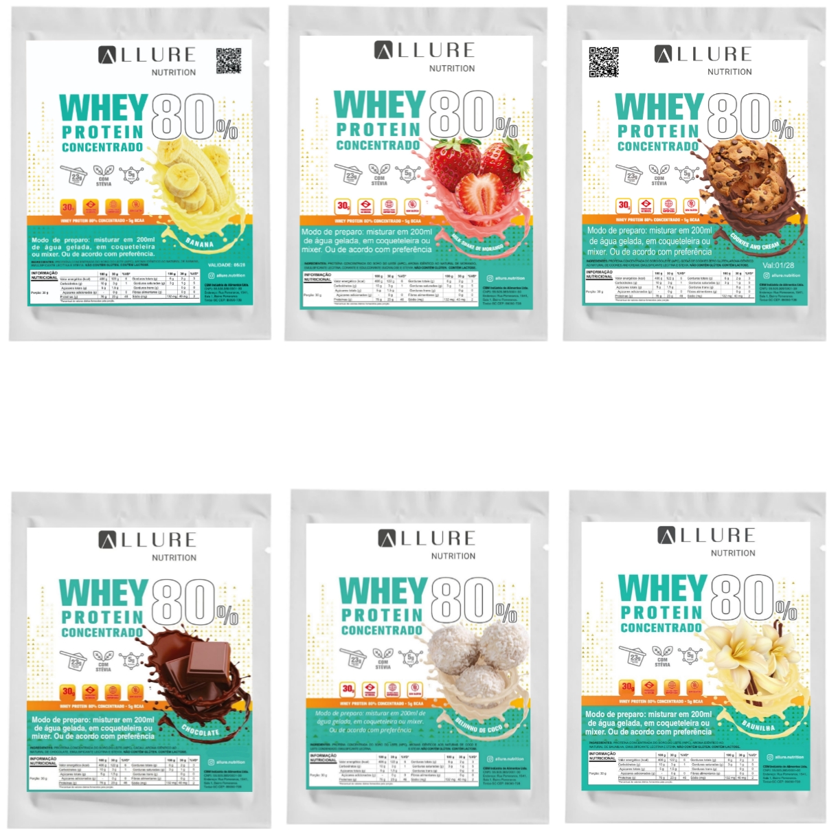 Kit com 6 unidades de 30g cada de nosso Whey Protein Concentrado. Cada Kit contém: 1 unidade sabor Baunilha, 1 unidade sabor Chocolate, 1 unidade sabor Beijinho de Coco, 1 unidade sabor Morango, 1 unidade sabor Cokkies and Cream e 1 unidade sabor Banana.