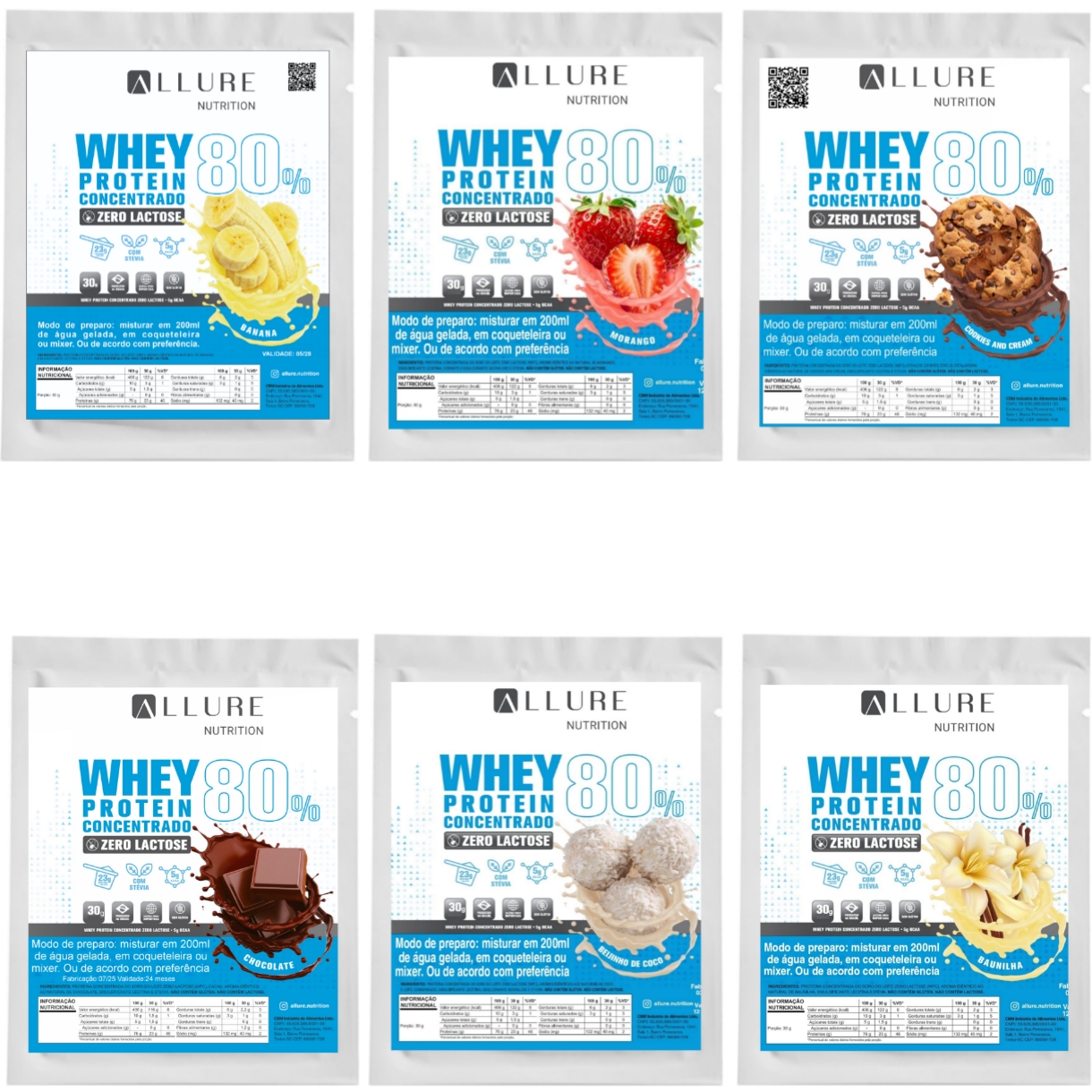 Kit com 6 unidades de 30g cada de nosso Whey Protein Zero Lactose. Cada Kit contém: 1 unidade sabor Baunilha, 1 unidade sabor Chocolate, 1 unidade sabor Beijinho de Coco, 1 unidade sabor Morango, 1 unidade sabor Cookies and Cream e 1 unidade sabor Banana.